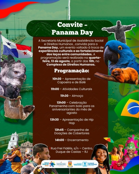 A Prefeitura de Duque de Caxias, por meio da Secretaria Municipal de Assistência Social e Direitos Humanos, do Centro de Cidadania LGBTI e do Consulado-Geral do Panamá, convida para o Panama Day, um evento voltado à troca de experiências culturais e ao fortalecimento dos laços entre comunidades. A atividade será realizada nesta quarta-feira, 13 de agosto, a partir das 10h30 às 15h00, no Complexo de Direitos Humanos, localizado na Rua Frei Fidélis, s/nº, Centro de Duque de Caxias..
