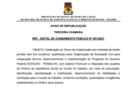 A Prefeitura de Duque de Caxias, através da Secretaria Municipal de Assistência Social e Direitos Humanos, divulga Edital de Chamamento Público nº 001/2021, que trata do Programa do Governo Federal ACESSUAS - Trabalho, com o objetivo de promover a integração dos usuários da política de assistência social ao mundo do trabalho no município de Duque de Caxias. .