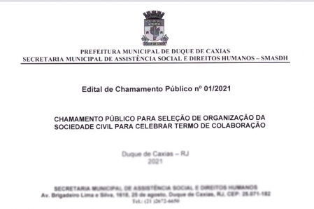 A Prefeitura de Duque de Caxias, através da Secretaria Municipal de Assistência Social e Direitos Humanos, com esteio na Lei nº 13.019, de 31 de julho de 2014, Deliberação 277/2017 do Tribunal de Contas do Estado de Rio de Janeiro - TCE-RJ, divulga Edital de Chamamento Público nº 001/2021, que trata do Programa do Governo Federal ACESSUAS - Trabalho, com o objetivo de promover a integração dos usuários da política de assistência social ao mundo do trabalho no município de Duque de Caxias..