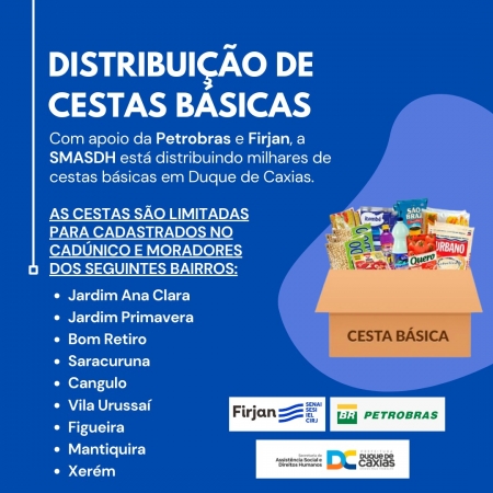 Com apoio da Petrobras e da Firjan, a Secretaria de Assistência Social e Direitos Humanos de Duque de Caxias está distribuindo cestas básicas na cidade..