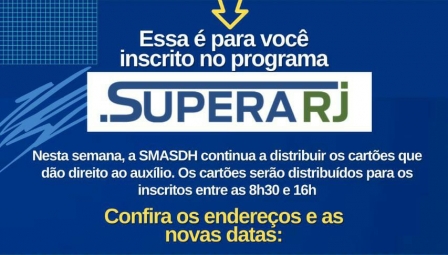 A Secretaria Municipal de Assistência Social e Direitos Humanos de Duque de Caxias será a responsável pela entrega dos cartões do Programa Supera RJ do Governo do Estado aos beneficiários a partir de segunda-feira (26), na cidade. O Supera RJ é um programa de auxílio emergencial de renda para os cidadãos em estado de vulnerabilidade..