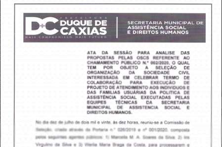 RESULTADO PRELIMINAR DO CHAMAMENTO PÚBLICO N.º 002/2020 PARA SELEÇÃO DE ORGANIZAÇÃO DA SOCIEDADE CIVIL PARA CELEBRAR PARCERIA ATRAVÉS DO TERMO DE COLABORAÇÃO ASSISTÊNCIA SOCIAL E DIREITOS HUMANOS 10/07/2020 A SECRETARIA MUNICIPAL DE ASSISTÊNCIA SOCIAL E DIREITOS HUMANOS DE DUQUE DE CAXIAS – RJ, com esteio na Lei no 13.019, de 31 de julho de 2014, Deliberação 277/2017 do Tribunal de Contas do Estado do Rio de Janeiro – TCE-RJ, torna público o resultado preliminar do chamamento público n.º 002/2020, tendo sido classificadas e habilitadas as seguintes instituições:.
