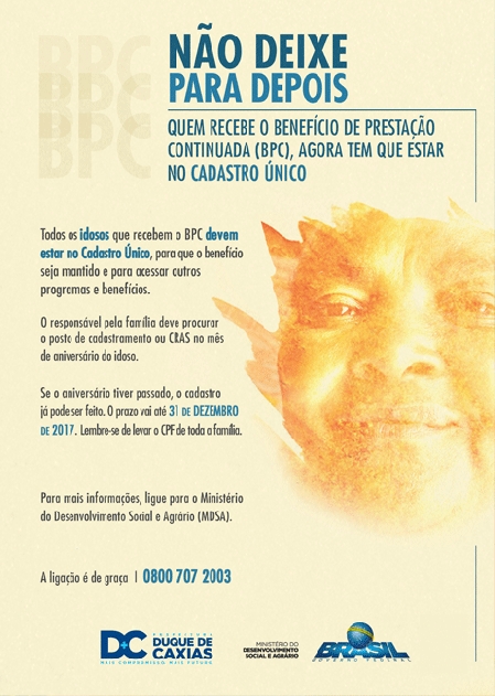A Secretaria Municipal de Assistência Social e Direitos Humanos (SMASDH) informa aos idosos cadastrados no Benefício de Prestação Continuada (BPC), conhecido como LOAS, que os mesmos devem comparecer ao Centro de Referência de Assistência Social (CRAS) ou aos pontos de atendimento mais próximos de sua casa para fazerem a revisão cadastral até o dia 31/12/2017. Os beneficiários que não se inscreverem no Cadastro Único terão o BPC suspenso. .