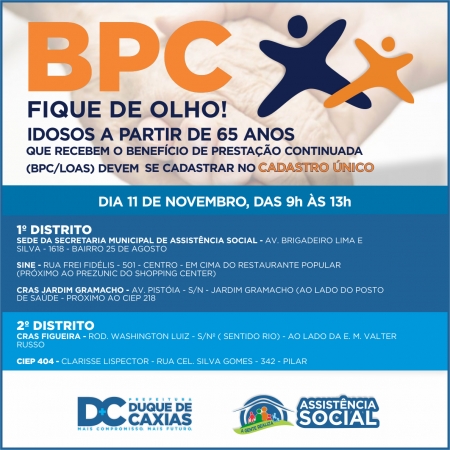 A Secretaria Municipal de Assistência Social e Direitos Humanos (SMASDH) fará um mutirão neste sábado, 11/11, das 9h às 13h, para cadastrar os idosos que já recebem o BPC (Benefício de Prestação Continuada). Os beneficiários que não se inscreverem no Cadastro Único terão o BPC suspenso. .