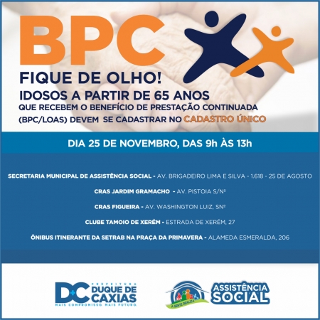 A Secretaria Municipal de Assistência Social e Direitos Humanos (SMASDH) fará mais um mutirão neste sábado, 25/11, das 9h às 13h, para cadastrar os idosos que já recebem o BPC (Benefício de Prestação Continuada). Os beneficiários que não se inscreverem no Cadastro Único terão o BPC suspenso. .