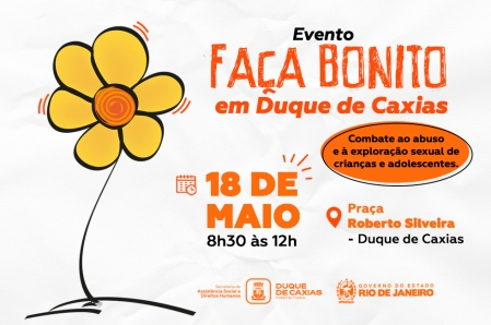 A Prefeitura, por meio da Secretaria Municipal de Assistência Social e Direitos Humanos, promove, no próximo domingo, 18 de maio, a partir das 8h30, na Praça Roberto Silveira, Centro de Duque de Caxias, uma importante ação de mobilização e conscientização da campanha Faça Bonito, que integra o movimento nacional do Maio Laranja, mês dedicado ao enfrentamento do abuso e da exploração sexual de crianças e adolescentes..