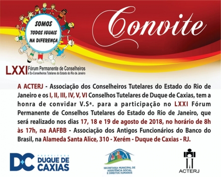 A Associação dos Conselheiros e Ex-Conselheiros Tutelares do Estado do Rio de Janeiro (ACTERJ), a Regional Baixada Fluminense e o Conselho Tutelar do Município de Duque de Caxias convidam os conselheiros e ex-conselheiros tutelares do Estado do Rio de Janeiro.