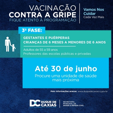 A Campanha Nacional de Vacinação contra a Gripe deverá ser encerrada na próxima terça-feira, 30 de junho. Até esta data devem ser vacinados contra a doença o público-alvo dessa terceira fase da campanha, que inclui: Adultos de 55 a 59 anos; Motoristas de transporte coletivo (apresentar crachá da empresa); Taxistas maiores de 55 anos; Grávidas e Puérpera (até 45 dias); Professores de escolas públicas e privadas e Crianças, de 6 meses a menores de 6 anos. A Secretaria Municipal de Saúde e Defesa Civil de Duque de Caxias faz um alerta para a baixa procura pela vacina contra a gripe por crianças de 6 meses e menores de 6 anos, grávidas e puérperas (até 45 dias). .