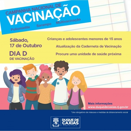 Dando continuidade à campanha de vacinação contra a Poliomielite, Multivacinação e Sarampo, a Secretaria Municipal de Saúde e Defesa Civil de Duque de Caxias promove neste sábado, 17/10, das 8h às 17h, o Dia D de mobilização para vacinação no município. .