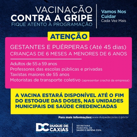 A campanha de vacinação contra a gripe foi prorrogada pela Secretaria Municipal de Saúde e Defesa Civil de Duque de Caxias. A vacina ficará disponível nas unidades de saúde da cidade até o fim do estoque das doses. O objetivo é imunizar o maior número de pessoas dos grupos de maior vulnerabilidade, que ainda não atingiram a meta de cobertura, como crianças (de 6 meses e menores de 6 anos), gestantes e puérperas (mulheres que deram à luz até 45 dias). .