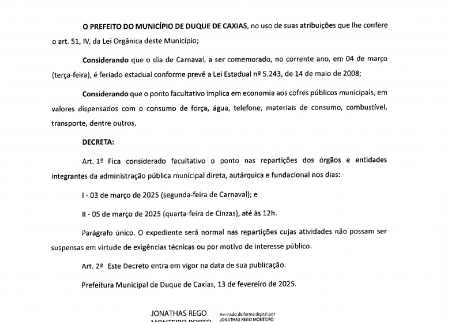 A Prefeitura de Duque de Caxias publicou o Decreto nº 8.874, de 13 de fevereiro de 2025..