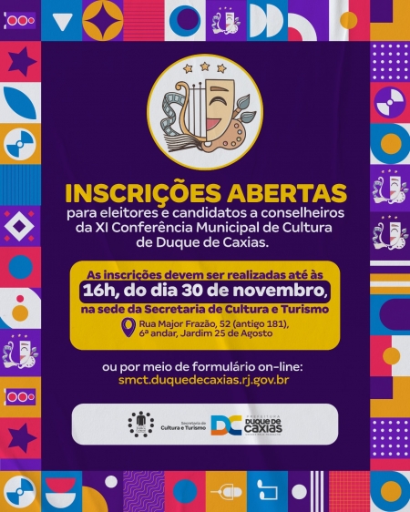 A Secretaria Municipal de Cultura e Turismo e o Conselho Municipal de Política Cultural (CMPC) de Duque de Caxias informam que estão abertas as inscrições para eleitores e candidatos a conselheiros da XI Conferência Municipal de Cultura de Duque de Caxias. .