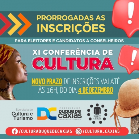 A Secretaria Municipal de Cultura e Turismo e o Conselho Municipal de Política Cultural (CMPC) de Duque de Caxias informam que foram prorrogadas as inscrições para eleitores e candidatos a conselheiros da XI Conferência Municipal de Cultura de Duque de Caxias. O novo prazo de inscrições vai até às 16h, do dia 4 de dezembro. .