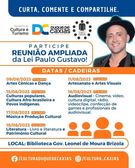 A Secretaria Municipal de Cultura e Turismo de Duque de Caxias e o Conselho Municipal de Política Cultural divulgam o calendário das reuniões ampliadas da Lei Paulo Gustavo, tendo como público-alvo representantes dos diversos segmentos culturais do município. .