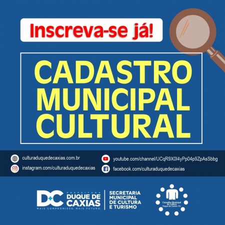 A Secretaria Municipal de Cultura e Turismo de Duque de Caxias, em parceria com o Conselho Municipal de Política Cultural, está disponibilizando o Cadastro Municipal Cultural, que vai fazer o mapeamento e a atualização de profissionais, espaços, grupos, instituições e coletivos que integram o universo produtivo da Cultura em nossa cidade. .