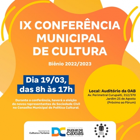 A Secretaria Municipal de Cultura e Turismo de Duque de Caxias e o Conselho Municipal de Política Cultural (CMPC) realizam, neste sábado, 19/03, a IX Conferência Municipal de Cultura, das 8h às 17h, no Auditório da OAB Duque de Caxias, localizado na Av. Perimetral Curupaiti, 312/370, no bairro Jardim 25 de Agosto..