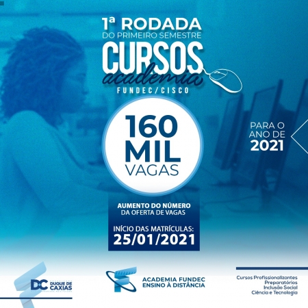 Na última segunda-feira (24/10), a Prefeitura de Duque de Caxias, através da Secretaria Municipal de Ciência e Tecnologia, em pareceria com a Academia Cisco, abriu o último período de inscrições deste ano para 28 mil vagas nos cursos a distância gratuitos da Fundec. Apenas neste ano, a Fundec ofereceu mais de 200 mil vagas em seus cursos..