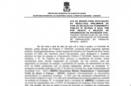 A SECRETARIA MUNICIPAL DE ASSISTÊNCIA SOCIAL E DIREITOS HUMANOS DE DUQUE DE CAXIAS – RJ, com esteio na Lei nº 13.019, de 31 de julho de 2014, Deliberação 277/2017 do Tribunal de Contas do Estado do Rio de Janeiro – TCE-RJ, torna público o resultado preliminar do chamamento público nº 001/2023, tendo sido desclassificadas ambas as OSC´s. E, em cumprimento ao Edital, os participantes que desejarem interpor recurso contra o resultado preliminar, deverá apresentar recurso administrativo, no prazo de 5 (cinco) dias úteis, contados a partir do primeiro dia útil seguinte à divulgação do resultado preliminar. Os referidos recursos devem ser apresentados por meio físico para a Comissão de Seleção, conforme previsto no item 11.1 do Edital. .