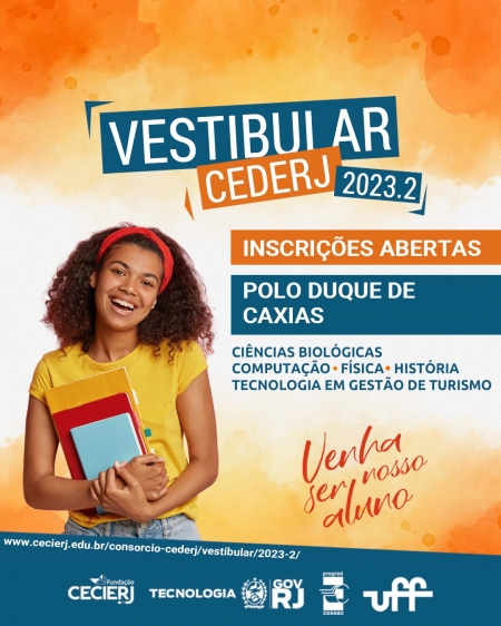 Os candidatos já podem fazer a inscrição no Vestibular Cederj 2023.2 e concorrer a 7.589 vagas distribuídas em 16 cursos de graduação, ofertados de forma gratuita e na modalidade semipresencial. O prazo é até 07 de maio, exclusivamente pela página www.cecierj.edu.br/consorcio-cederj/vestibular/2023-2/. A taxa é no valor de R$ 89,90 e pode ser paga até 08 de maio. O Consórcio Cederj reúne instituições de ensino superior sediadas no Estado do Rio e é coordenado pela Fundação Cecierj, vinculada da Secretaria de Estado de Ciência, Tecnologia e Inovação..