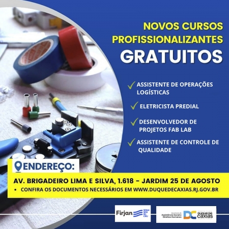 A Prefeitura de Duque de Caxias, através da Secretaria Municipal de Assistência Social e Direitos Humanos, em parceria com a Firjan, está disponibilizando novas vagas para cursos de qualificação profissional. Há vagas disponíveis para operador de máquinas de usinagem com comando numérico computadorizado- CNC, operador de máquinas de usinagem convencionais, assistente de operações em logística, mecânico de manutenção, eletricista predial, assistente de operações em logística, desenvolvedor de projetos Fab Lab e assistente de controle e qualidade. .
