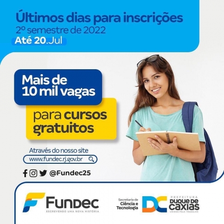 Nesta segunda-feira (4), a Prefeitura de Duque de Caxias, através da Secretaria Municipal de Ciência e Tecnologia, abriu o período de inscrições para mais de 10 mil vagas em cursos presenciais e gratuitos nas 24 unidades da Fundec distribuídas pelos quatro distritos da cidade..