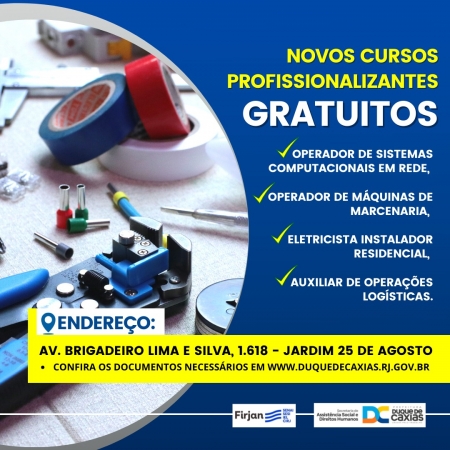 A Prefeitura de Duque de Caxias, através da Secretaria Municipal de Assistência Social e Direitos Humanos, em parceria com a Firjan, está disponibilizando novas vagas para cursos de qualificação profissional. Há vagas disponíveis para operador de sistemas computacionais em rede, operador de máquinas de marcenaria, eletricista instalador residencial e auxiliar de operações logísticas..