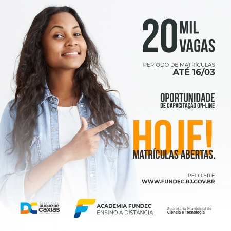 A Prefeitura de Duque de Caxias, por meio da Academia Fundec de Ensino à Distância e a Cisco (empresa de tecnologia), vai abrir na próxima segunda-feira (01/03), o período de matrículas para cursos online. Os interessados devem fazer as inscrições até o dia 09 de março..