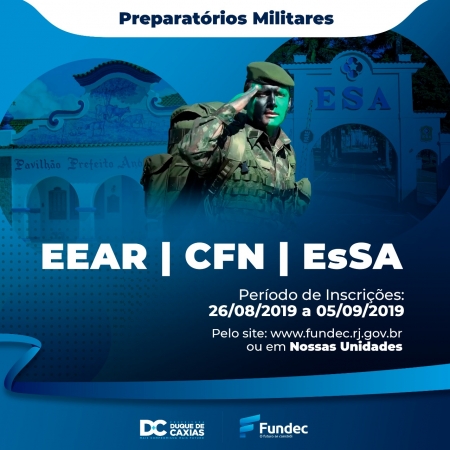 A Prefeitura de Duque de Caxias, através da Fundec – Fundação de Apoio à Escola Técnica, Ciência, Tecnologia, Esporte, Lazer, Cultura e Políticas Sociais, deu início nesta segunda-feira (26/08), ao período de inscrições para os cursos preparatórios de acesso as Escolas Militares, em específico QMS-EsSA (Qualificação Militar Escola de Sargentos das Armas) Geral, Aviação e Música, CFS-EEAr (Curso de Formação da Escola de Especialistas da Aeronáutica) e CFSG-UM-CFN (Curso de Formação de Sargento Músico do Corpo de Fuzileiros Navais). Os cursos serão ministrados no Polo de Música Ricardo Boechat – Doutor Laureano, na unidade Tamoio e na unidade Primavera. As inscrições se encerram no dia 05/09. .