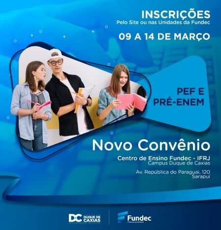 A Prefeitura de Duque de Caxias, através da Fundec - Fundação de Apoio à Escola Técnica, Ciência, Tecnologia, Esporte, Lazer, Cultura e Políticas Sociais, irá iniciar no dia 09/03 o período de inscrições para os cursos preparatórios direcionados aos jovens e adultos que buscam a aprovação em Escolas Técnicas, Enem e outras Instituições de Ensino Superior. A Fundação, em convênio com o IFRJ estará disponibilizando 80 vagas. .