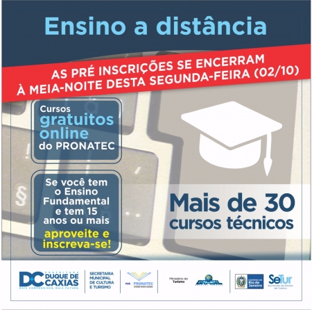 A Prefeitura de Duque de Caxias, através da SMCT – Secretaria Municipal de Cultura e Turismo, em parceria com a Secretaria Estadual de Turismo do RJ e com o Ministério do Turismo, anuncia a abertura de inscrições para cursos de Formação Inicial e Continuada (FIC), na modalidade EAD – Ensino à Distância, promovidos pelo Programa de Regionalização do Pronatec Turismo. As vagas são para todos os moradores de Duque e Caxias que tenham iniciado os estudos no ensino fundamental e que tenham no mínimo 15 anos de idade. O aluno tem que ter acesso a internet para acompanhar as aulas. Só é permitida uma inscrição por aluno (validado pelo CPF) e cada aluno só pode escolher um Curso. AS PRÉ-INSCRIÇÕES PARA OS CURSOS PRONATEC SE ENCERRAM A MEIA-NOITE DESTA SEGUNDA-FEIRA (02/10) . Consulte a lista, escolha seu curso e inscreva-se..