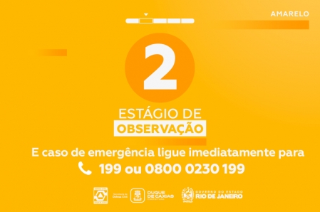 A Prefeitura de Duque de Caxias, através da Secretaria Municipal de Defesa Civil, informa que o município retornou, no início da tarde deste sábado (26/07), para o estágio de Observação, devido a ausência de precipitação significativa nas últimas 12 horas e a diminuição nos acumulados pluviométricos nas últimas 24 horas..