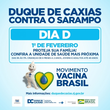 A Prefeitura de Duque de Caxias, através da secretaria Municipal de Saúde e Defesa Civil, promove no próximo sábado (01/02), mais um DIA D contra o sarampo no município, das 9h às 17h. A ação tem como público-alvo crianças de 6 meses a 2 anos - faixa etária que corresponde a 90% da população mais afetada pela doença no município - além de jovens e adultos até 49 anos. .