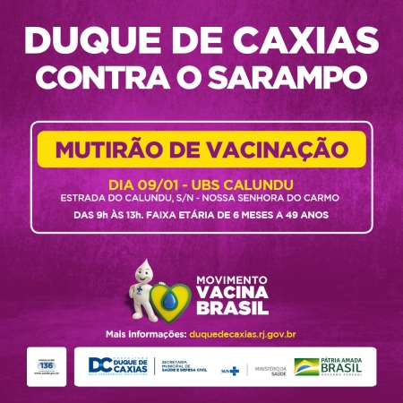 A Prefeitura de Duque de Caxias, através da Secretaria Municipal de Saúde e Defesa Civil (SMSDC), segue com a imunização contra o sarampo no município. A vacina está sendo disponibilizada em mais de 50 unidades de saúde espalhadas nos quatro distritos. Desde agosto de 2019, o município vem intensificando as ações de vacinação contra o sarampo, com o objetivo de interromper a circulação do vírus e bloquear a incidência de casos da doença na cidade. A prioridade é imunizar e verificar as cadernetas de vacinação das crianças de 6 meses a 2 anos, além de vacinar jovens e adultos até 49 anos. .