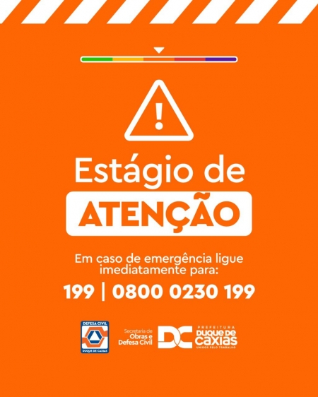 A Prefeitura de Duque de Caxias, através da Secretaria Municipal de Obras e Defesa Civil, informa que, devido à previsão de chuva de moderada a forte, a partir desta sexta-feira (27/12), o município encontra-se em estágio de observação. A Defesa Civil pede aos moradores das regiões consideradas de risco que, ao notarem qualquer anormalidade, procurem um local seguro ou os pontos de apoio, localizados em igrejas, associações de moradores e escolas de cada distrito, e liguem imediatamente para os telefones 199 e 08000230199, ou para o Corpo de Bombeiros, no número 193. O órgão segue fazendo o monitoramento das chuvas e rios e alertando a população através da Rede Social e SMS..