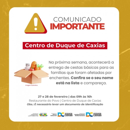 Dando continuidade a distribuição das cestas básicas às famílias atingidas pelo temporal de janeiro, o Governo Federal, por meio do Ministério de Desenvolvimento e Assistência Social, Família e Combate à Fome, e a Prefeitura de Duque de Caxias, através da Secretaria Municipal de Assistência Social e Direitos Humanos e a Secretaria Municipal de Obras e Defesa Civil, vão fornecer os suprimentos, durante dois dias da próxima semana, no Restaurante de Povo. .