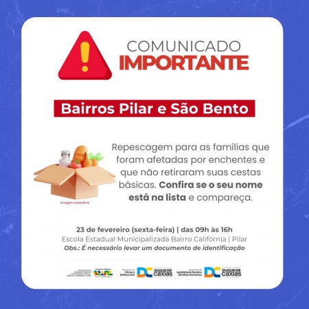O Governo Federal, por meio do Ministério de Desenvolvimento e Assistência Social, Família e Combate à Fome, e a Prefeitura de Duque de Caxias, através da Secretaria Municipal de Assistência Social e Direitos Humanos e a Secretaria Municipal de Obras e Defesa Civil, vão realizar a repescagem da distribuição de suprimentos, em forma de cestas básicas, com única data nesta sexta-feira (23), para os bairros do São Bento e Pilar. .