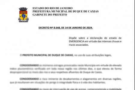 A Prefeitura de Duque de Caxias divulgou o decreto nº 8.648, de 14 de janeiro de 2024. O documento dispõe sobre a declaração de estado de emergência em virtude das intensas chuvas e riscos associados. Além disso, ficam mobilizados todos os órgãos municipais para atuarem sob a coordenação da Defesa Civil Municipal, em ações de resposta ao desastre e reabilitação do cenário e reconstrução..
