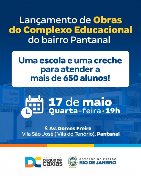 Na próxima quarta-feira, (17/05), a Prefeitura de Duque de Caxias, por meio da Secretaria de Obras e Defesa Civil e da Secretaria de Educação, fará mais um lançamento de obras, desta vez um complexo educacional da rede municipal, na avenida Gomes Freire - Vila São José (Vila do Tenório), no bairro do Pantanal. O projeto busca trazer cada vez mais alunos para dentro das salas de aulas..