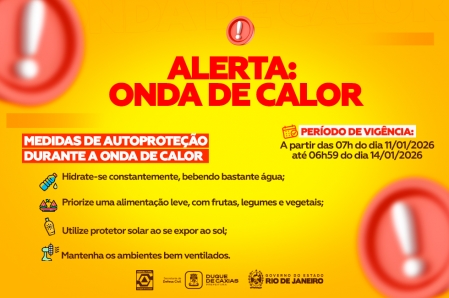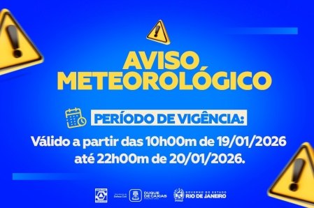 A Prefeitura de Duque de Caxias, por meio da Secretaria Municipal de Defesa Civil, divulga o aviso meteorológico, válido para o município, a partir das 10 horas de 19/01/2026 até às 22 horas de 20/01/2026..