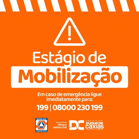A Secretaria de Obras e Defesa Civil de Duque de Caxias informa que, por causa da previsão de chuvas de moderada a forte nas próximas horas, o município entrou em estágio de Mobilização nesta segunda-feira (30). A Defesa Civil pede aos moradores das regiões consideradas de risco atingidas pelas chuvas que, ao notarem qualquer anormalidade, procurem um local seguro ou os pontos de apoio, localizados em igrejas, associações de moradores e escolas de cada distrito, e liguem imediatamente para os telefones 199 e 08000230199, ou para o Corpo de Bombeiros, no número 193..