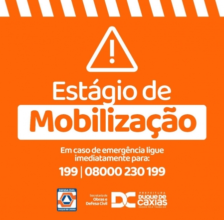 A Secretaria de Obras e Defesa Civil de Duque de Caxias informa que, por causa da previsão de chuvas de moderada a forte nas próximas horas, o município entrou em estágio de Mobilização nesta terça-feira (24). A Defesa Civil pede aos moradores das regiões consideradas de risco atingidas pelas chuvas que, ao notarem qualquer anormalidade, procurem um local seguro ou os pontos de apoio, localizados em igrejas, associações de moradores e escolas de cada distrito, e liguem imediatamente para os telefones 199 e 08000230199, ou para o Corpo de Bombeiros, no número 193..