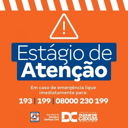 A Prefeitura de Duque de Caxias, através da Defesa Civil Municipal, informa que, nesta quinta-feira (14/04), o município se encontra em estágio de atenção devido às fortes chuvas que ocorreram de madrugada. Nenhuma das 18 sirenes de alarme do município foram acionadas e mensagens de SMS foram enviadas todos os moradores cadastrados, informando sobre a necessidade de atenção para as próximas horas. A Defesa Civil pede aos moradores de áreas de risco que, ao notarem qualquer anormalidade, procurem um local seguro ou os pontos de apoio localizados em igrejas, associações de moradores e escolas de cada distrito e liguem imediatamente para os telefones 199 e 08000230199 ou para o Corpo de Bombeiros, no número 193..