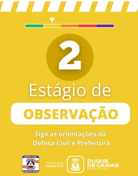 A Prefeitura de Duque de Caxias, por meio da Defesa Civil Municipal, informa que, em virtude da previsão da meteorologia de ausência de chuvas significativas para as próximas horas, o município está em estágio de OBSERVAÇÃO, hoje, 07/11, às 10h09..