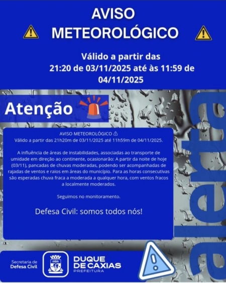 A prefeitura de Duque de Caxias por meio da Defesa Civil municipal, informa que a influência de áreas de instabilidades ocasionarão *a partir da noite de HOJE (03/11)*, 21h05, pancadas de chuvas moderadas, acompanhadas de descargas atmosféricas (raios) e rajadas de ventos.