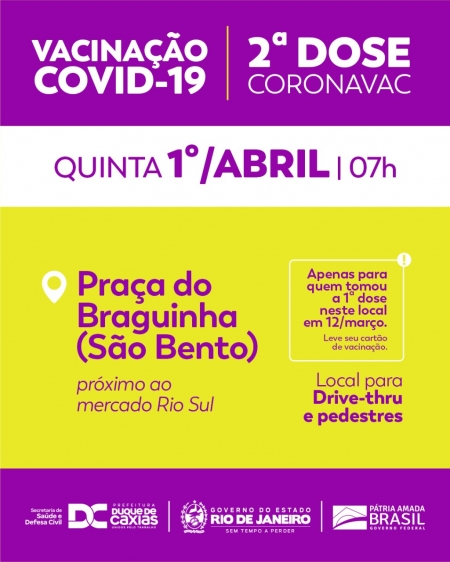 A Prefeitura de Duque de Caxias, através da Secretaria Municipal de Saúde e Defesa Civil, convoca os idosos que tomaram a primeira dose da vacina Coronavac no dia 12/03, para receberem a segunda dose nesta quinta-feira (01)..