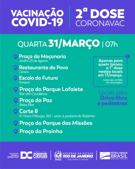 A Prefeitura de Duque de Caxias, através da Secretaria Municipal de Saúde e Defesa Civil, convoca os idosos de 77 anos ou mais, que tomaram a primeira dose da vacina Coronavac no dia 11/03, para receberem a segunda dose nesta quarta-feira (31)..