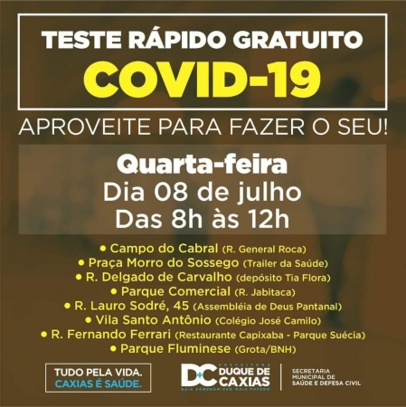 A ação de testagem rápida para a Covid-19 chega em mais bairros de Duque de Caxias nesta nesta quarta-feira (08). As equipes da Secretaria Municipal de Saúde e Defesa Civil vão atuar: Campo do Sobral (Rua General Roca); Praça Morro do Sossego (Trailer da Saúde); Rua Delgado de Carvalho (depósito Tia Flora); Parque Comercial (Rua Jabitaca); Rua Lauro Sodré, 45 (Assembleia de Deus Pantanal); Vila Santo Antônio (Colégio José Camilo); Rua Fernando Ferrari (Restaurante Capixaba - Parque Suécia); Parque Fluminense (Grota/BNH), das 8h ao meio-dia. .