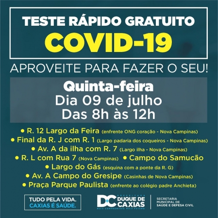 A ação de testagem rápida para a Covid-19 chega em mais bairros de Duque de Caxias nesta nesta quinta-feira (09). As equipes da Secretaria Municipal de Saúde e Defesa Civil vão atuar: Rua 12 Largo da Feira (em frente ONG Coração - Nova Campinas); Final da Rua J. com a Rua 1 (Largo Padaria dos Coqueiros - Nova Campinas); Av. A da ilha com Rua 7 (Largo Ilha - Nova Campinas); Rua L com Rua 7 (Nova Campinas); Campo do Samucão; Largo do Gás (esquina com a ponte da Rua G); Avenida A Campo do Gresipe (Casinhas de Nova Campinas); Praça Parque Paulista (em frente ao colégio Padre Anchieta), das 8h ao meio-dia. .