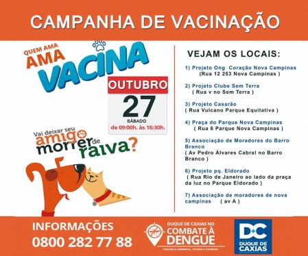 Neste sábado (10/11) a Prefeitura de Duque de Caxias, através da Superintendência de Vigilância Ambiental e Zoonoses, acontece mais um mutirão de combate à Dengue, Zika, Chikungunya e ações de Vacinação Contra a Raiva Animal, nos bairros Pauliceia e 25 de Agosto, no primeiro distrito. .