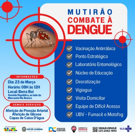 A Prefeitura de Duque de Caxias, através da Superintendência de Vigilância Ambiental, Vetores e Zoonoses (SVAVZ) da Secretaria Municipal de Saúde, promove, neste sábado (23), no bairro Pilar, mais um mutirão de combate à Dengue, Zika e Chikungunya, bem como de vacinação de cães e gatos contra a raiva animal. .